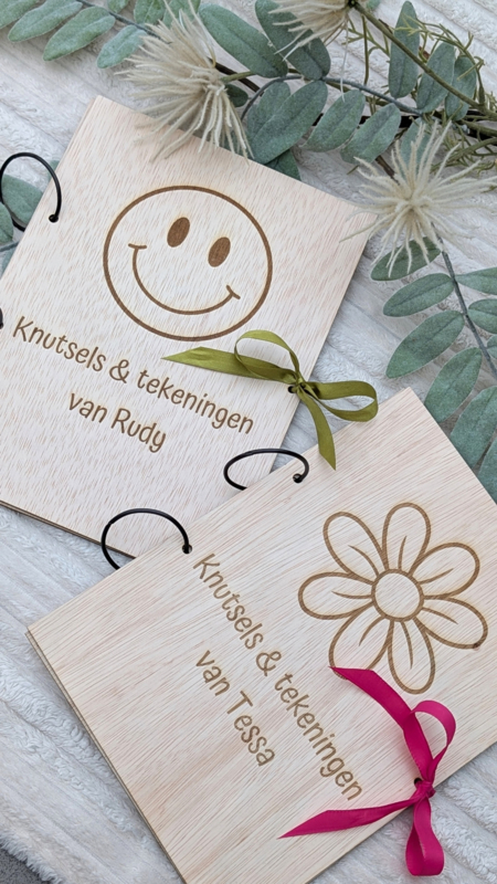 In deze bewaarbundel kun je alle knutsels en tekeningen mooi bewaren. Je kunt zelf het kleurlint uitkiezen (zie foto 3) en dit in de opties aangeven. Natuurlijk kun je ook een naam toevoegen om er een echte persoonlijke bewaarbundel van te maken.