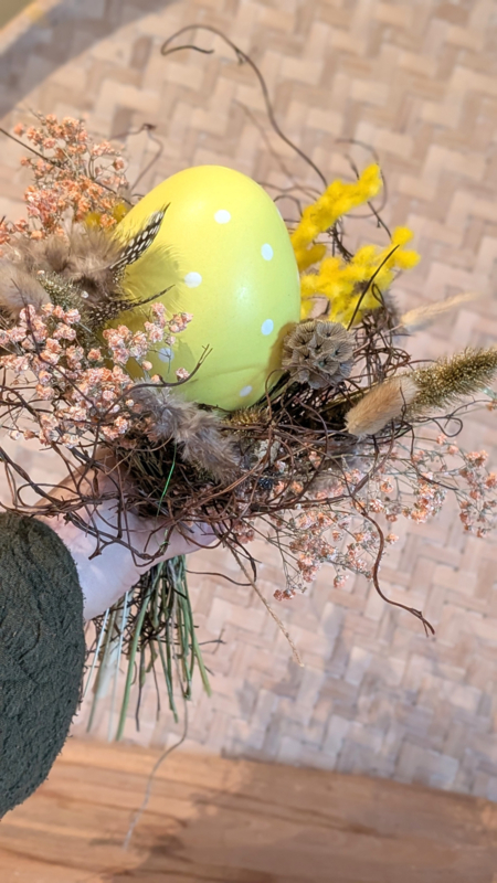 Een gezellig voorjaars- en paasbosje met droogbloemen en zijde bloemen in gele tinten. Gecombineerd met eitjes, veertjes en takjes die samen een sfeervol nestje vormen. Perfect als vrolijke paasdecoratie in huis of als leuk cadeautje voor het voorjaar. 🌸🥚