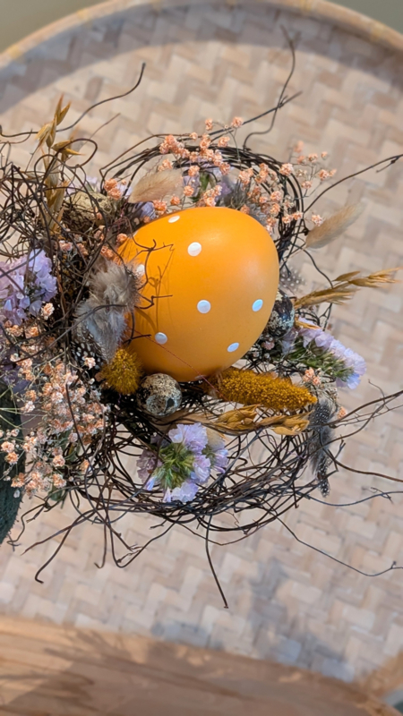 Een gezellig voorjaars- en paasbosje met droogbloemen in oranje tinten. Gecombineerd met eitjes, veertjes en takjes die samen een sfeervol nestje vormen. Perfect als vrolijke paasdecoratie in huis of als leuk cadeautje voor het voorjaar. 🌸🥚