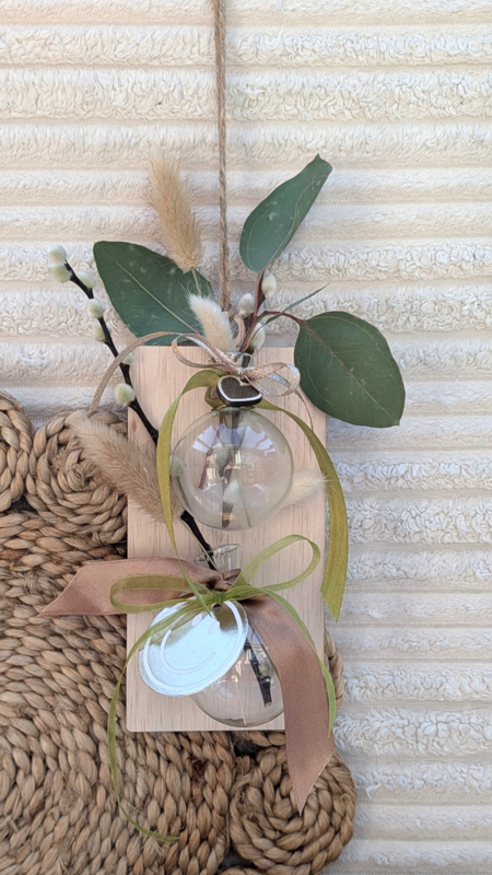 Houten wandhanger met 2 glazen bloemenvaasjes, gevuld met droogbloemen. Hierdoor heb je ontzettend lang plezier van deze leuke en sfeervolle wanddecoratie.