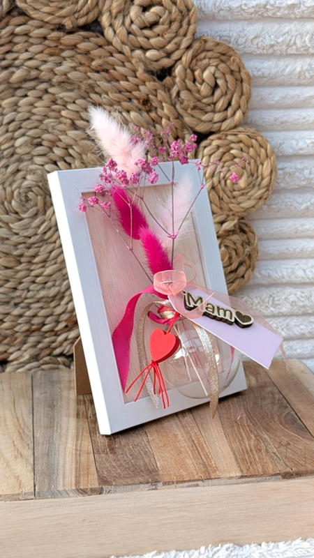 Een uniek en liefdevol lijstje, gecombineerd met een stijlvol glazen bloemenvaasje. Perfect om neer te zetten en een warm plekje in huis te geven.